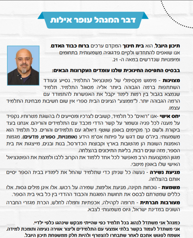 תיכון היובל ברוח כבוד האדם, מהתיכונים הוותיקים והמובילים בהרצליה, הוא בית חינוך המקדם ערכים ברוח כבוד האדם, מתחדש ומוביל מצוינות, פדגוגיה משמעותית וחדשנית, עניין ולימודים המקדמים את התלמידים למיומנויות המאה ה- 21.